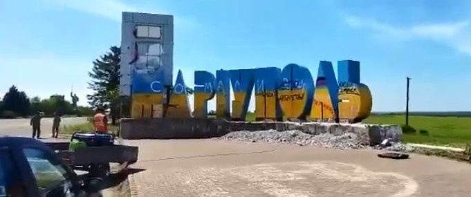 На въезде в Мариуполь демонтируют стелу с украинским названием.