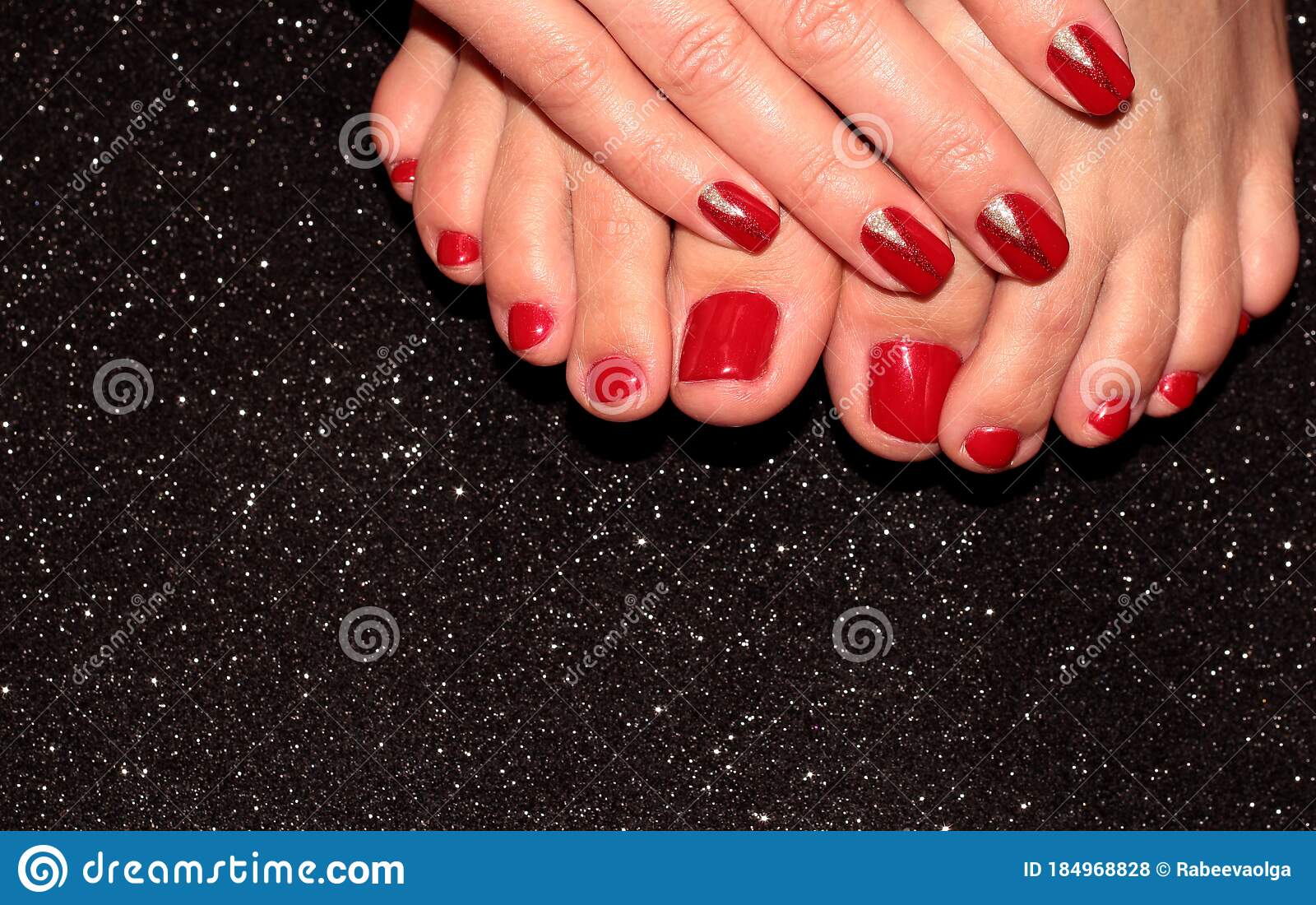 Красные педикюр и маникюр. Ноги и руки женщины на черном фоне Стоковое Фото - изображение насчитывающей человек, девушка: 184968828
