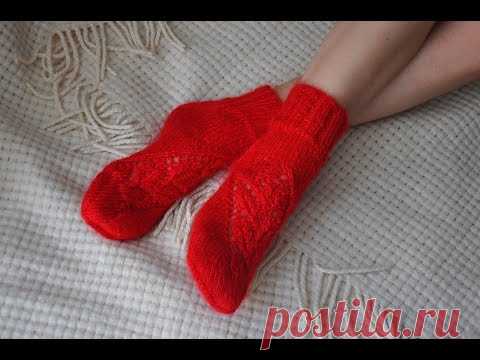 ЧАСТЬ 1 РЕЗИНКА И ПЯТКА АЖУРНЫЙ УЗОР ЛИСТИКИ ПО ДИАГОНАЛИ СПИЦАМИ КАК СВЯЗАТЬ НОСКИ СПИЦАМИ