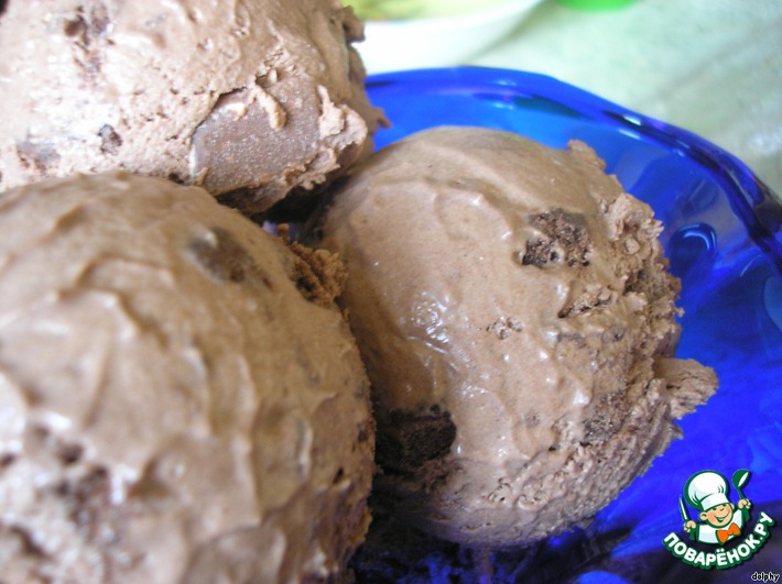 - Вмешайте ваши добавки. У меня это шоколадное печенье и кусочки шоколада Toblerone. Вы можете использовать одно печенье или заменить его шоколадом с орехами или кусочками шоколадного батончика типа Mars, здесь фантазия может быть безгранична. Вылейте мороженое в контейнер для заморозки, накройте и оставьте в морозилке на ночь или пока не затвердеет. Я сразу не стала вмешивать свои добавки, так как не поверила, что мороженое не закристаллизуется. Хотела это сделать на конечных этапах заморозки и перемешивания, но, когда увидела, что мороженое начало замерзать, а кристаллы не образуются, сразу замешала добавки в форму и спокойно легла спать )))
