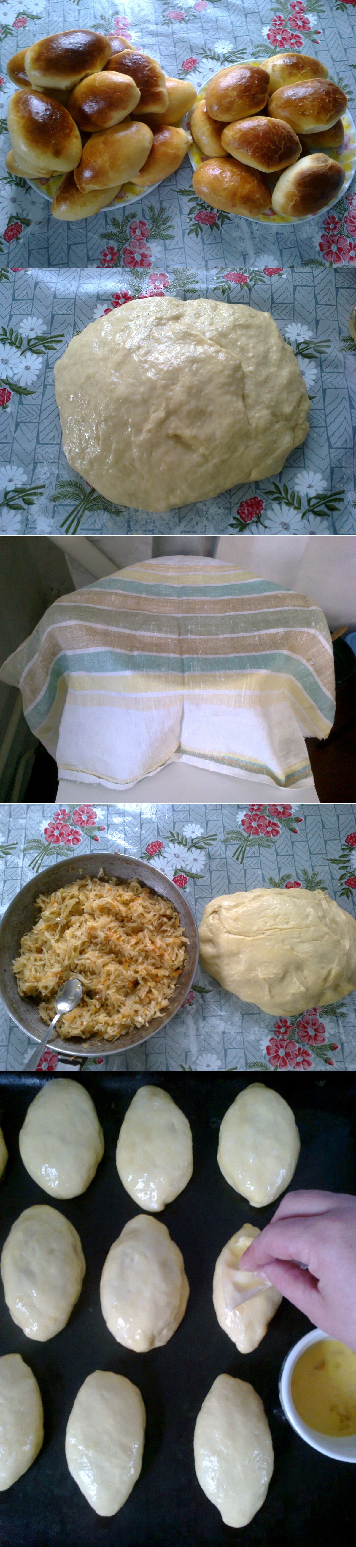 Пирожки с капустой. Тесто: 6 яиц, полтора стакана молока, 30 грамм дрожжей, муки, сколько возьмет, чтобы замесить эластичное тесто, 4 столовые ложки растительного масла, 2 столовые ложки сахара, 2 щепотки соли. Начинка:0, 7 кг свежей капусты, 0,5 кг квашеной капусты (здесь Вы можете изменить пропорции в зависимости от Вашего вкуса, кстати, изменить конечно же можно и начинку пирожков), 30 грамм растительного масла, соль, перец по вкусу.
