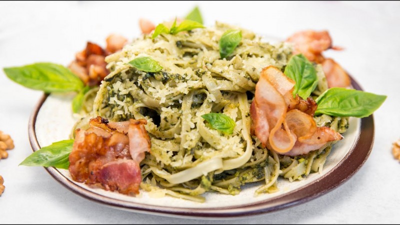 Макароны с беконом и ароматным соусом Ингредиенты (на 2-3 порции):- спагетти- пучок базилика (можно заменить шпинатом)- горсть грецких орехов (можно взять кедровые)- 1-2 зубчика чеснока- 4-5 ст.л. оливкового масла (можно взять и подсолнечное, которое без запаха)- полоски бекона (вместо них подойдет куриное филе, креветки,...