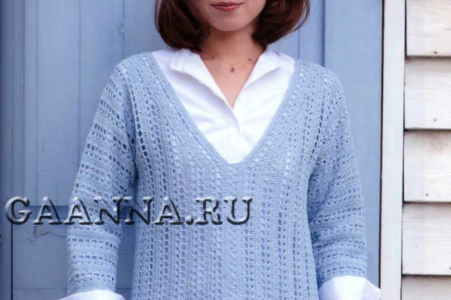 Бледно-голубой джемпер из журнала Let's Knit Series связан крючками № 2,5 и № 2,3 из 350 г пряжи (44% лен, 22% хлопок, 22% нейлон, 12% шелк; длина 140 м/ 40 г). Размер джемпера 44-46.