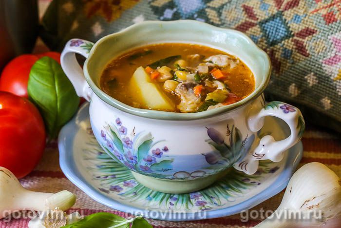 Суп бозбаш. Рецепт с фото Бозбаш - густой, наваристый кавказский суп, сваренный на баранине (но есть рецепты и с говядиной) с добавлением нута (но бывает и с каштанами). Для бульона обычно берут баранинку на кости: подойдет грудинка, ребра, лопатка. Овощи хорошо бы обжарить на жиру, вытопившемся из курдюка (для перечисленных продуктов будет достаточно 100г курдюка). Помидоры берите спелые, а если таких нет, то лучше консервированные в собственном соку (без кожицы). Суп под... Подробнее