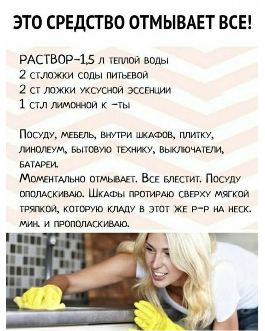 Photo by Полезные домашние хитрости on July 24, 2022. May be an image of 1 person and text that says 'это средство отмывает все! раствор-1,5 л теплой воды 2 стложки соды питьевой 2 CT ложки уксусной эссенции 1 стл лимонной κ -ты посуду, мебель, внутри шкафов, плитку, линолеум, бытовую технику, выключатели, батареи. моментально отмывает. все блестит. посуду ополаскиваю. шкафы протираю сверху мягкой тряпкой, которую кладу в этот же p-P на HECK. мин. и прополаскиваю.'.