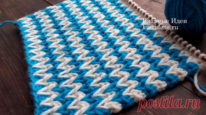 Цветной узор "Двухцветные зигзаги" спицами. Красивый, плотный, двухцветный узор в виде зигзагов. Раппорт узора 2 петли в ширину и 4 ряда в высоту. Цвет меняется каждые 4 ряда