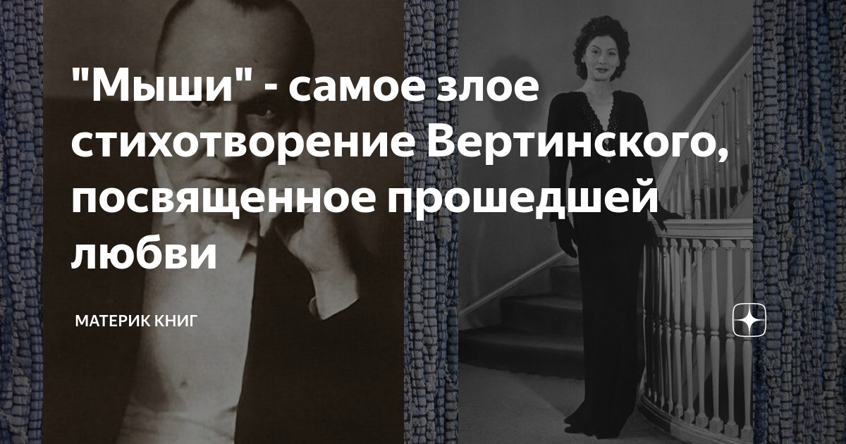 "Мыши" - самое злое стихотворение Вертинского, посвященное прошедшей любви В 1949 году Вертинский наконец-то получил то, к чему стремился. Он жил в Москве, молодая красавица-жена, две дочки, концертная деятельность, Родина, СССР. В прошлом бурные романы, удивительные приключения, интересные знакомства. Певец отметил 60-летие. Наверное, решил подвести какие-то итоги, вспомнить всё и всех? Однажды, весенним днем 24 апреля шансонье, видимо, взгрустнулось, и был он не в духе,...