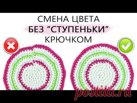 Смена цвета нити БЕЗ СТУПЕНЬКИ при круговом вязании крючком. ЛАЙФХАК!
