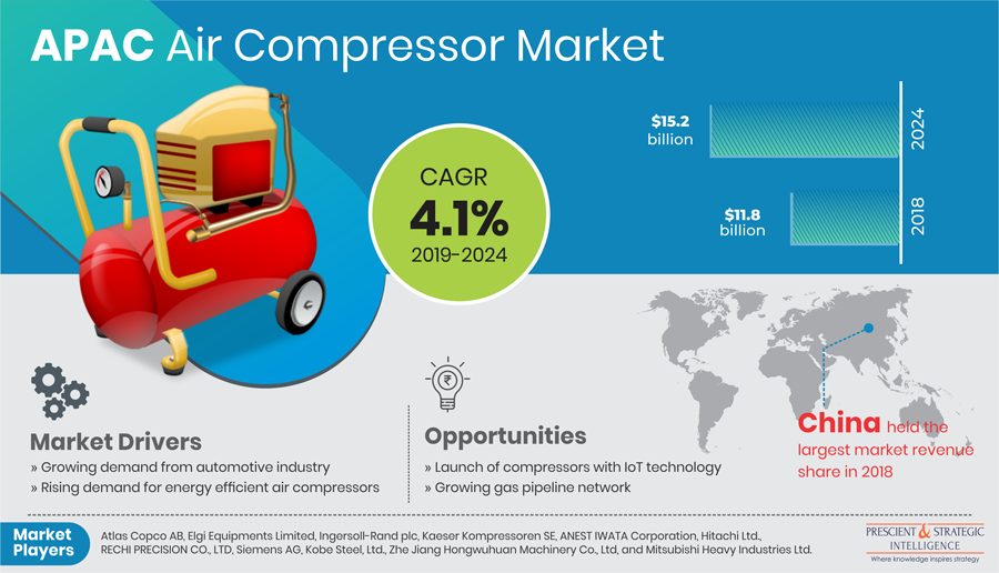 APAC air compressor market reached $11.8 billion in 2018 and is expected to register a CAGR of 4.1% during 2019-2024. Rising demand for energy efficient air compressors and growing demand from manufacturing industry are major drivers boosting the growth of the market. Moreover, with increasing focus toward the lower energy consumption, the demand for energy efficient compressors is growing.