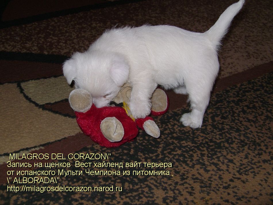 лемзавод " MILAGROS DEL CORAZON " c любовью и гордостью предлагает к резервированию малышей ВЕСТ ХАЙЛЕНД ВАЙТ ТЕРЬЕРА - 1 мальчика и 3 девочек ,рожденных от испанского производителя ,Мультичемпиона из лучшего питомника с мировым именем " ALBORADA"