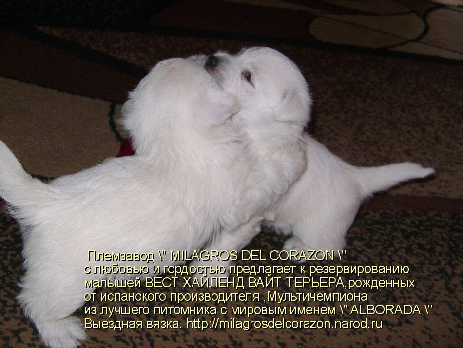 лемзавод " MILAGROS DEL CORAZON " c любовью и гордостью предлагает к резервированию малышей ВЕСТ ХАЙЛЕНД ВАЙТ ТЕРЬЕРА - 1 мальчика и 3 девочек ,рожденных от испанского производителя ,Мультичемпиона из лучшего питомника с мировым именем " ALBORADA"