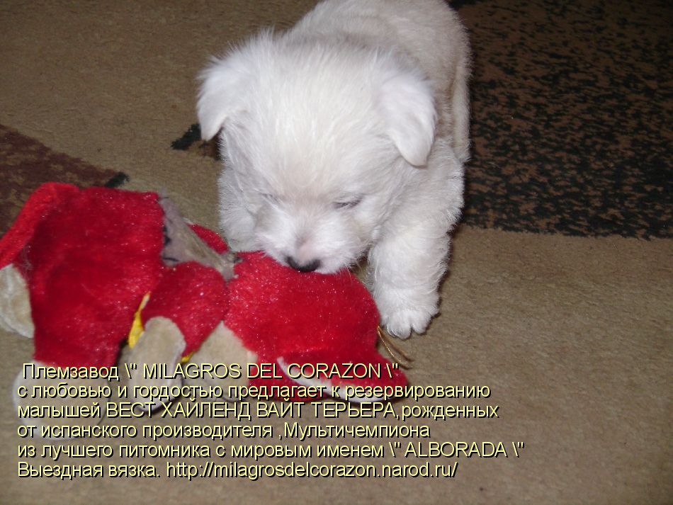 Племзавод " MILAGROS DEL CORAZON " c любовью и гордостью предлагает к резервированию малышей ВЕСТ ХАЙЛЕНД ВАЙТ ТЕРЬЕРА - 1 мальчика и 3 девочек ,рожденных от испанского производителя ,Мультичемпиона из лучшего питомника с мировым именем " ALBORADA"