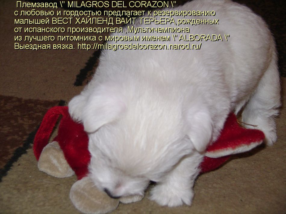 Племзавод " MILAGROS DEL CORAZON " c любовью и гордостью предлагает к резервированию малышей ВЕСТ ХАЙЛЕНД ВАЙТ ТЕРЬЕРА - 1 мальчика и 3 девочек ,рожденных от испанского производителя ,Мультичемпиона из лучшего питомника с мировым именем " ALBORADA"
