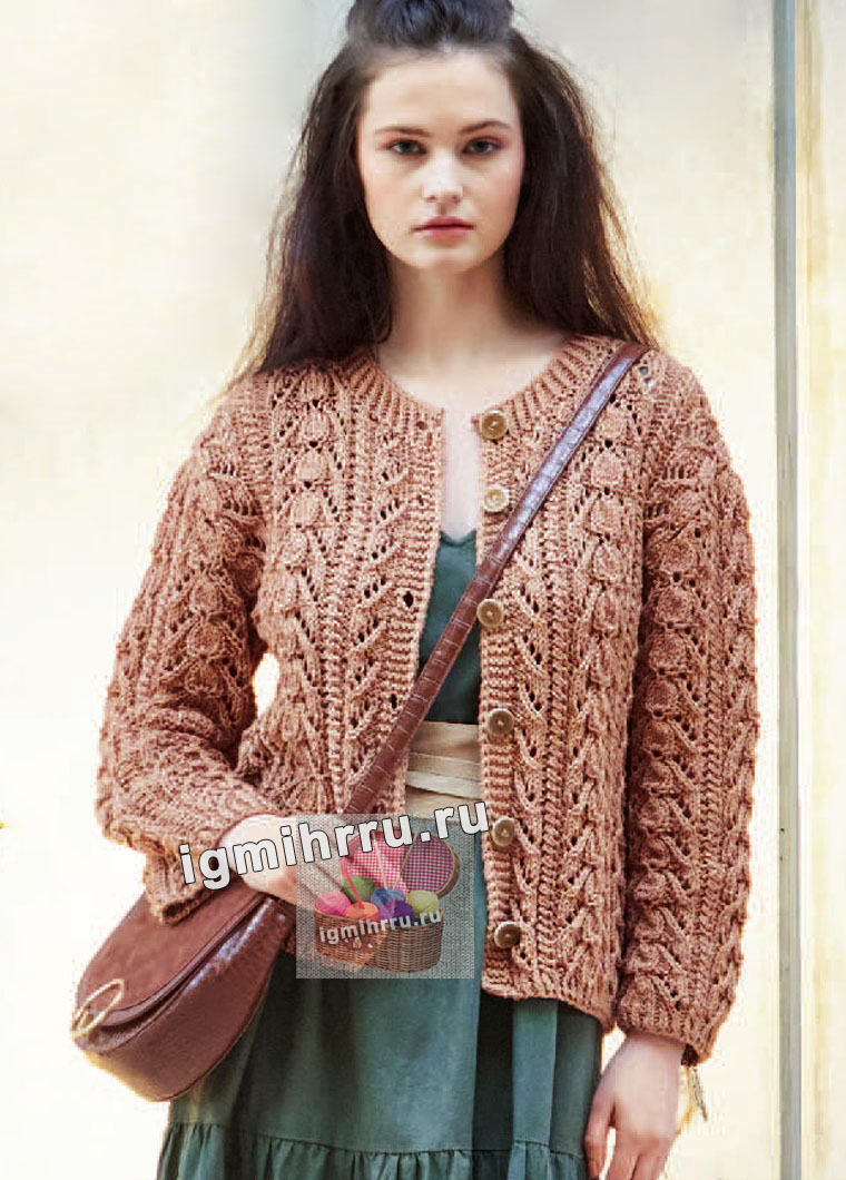 КОРИЧНЕВЫЙ ХЛОПКОВЫЙ ЖАКЕТ С АЖУРНЫМИ ПОЛОСАМИ.