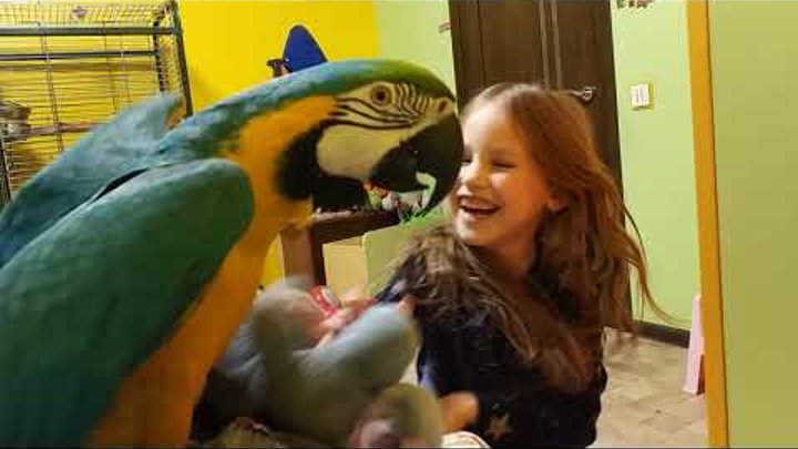 Попугай ара играет с ребенком
