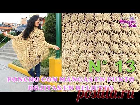 Poncho N° 13 tejido a crochet con MANGAS en punto HOJAS EN RELIEVES paso a paso TODAS LAS TALLAS