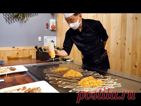 Артистическое блюдо теппаньяки, стейк из вырезки и морепродукты