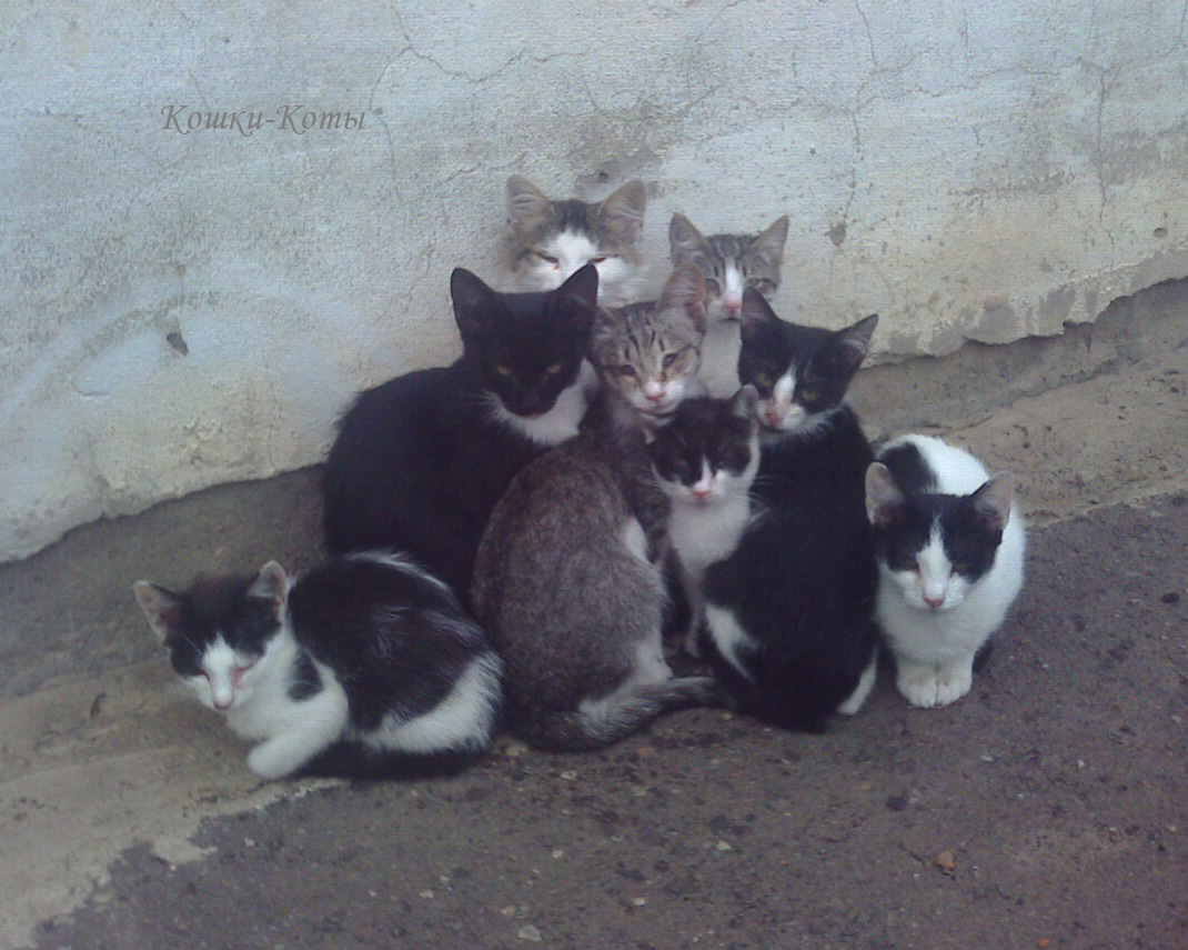 Отряд мышеловов в количестве восьми молодых котиков позируют для коллективного фото.