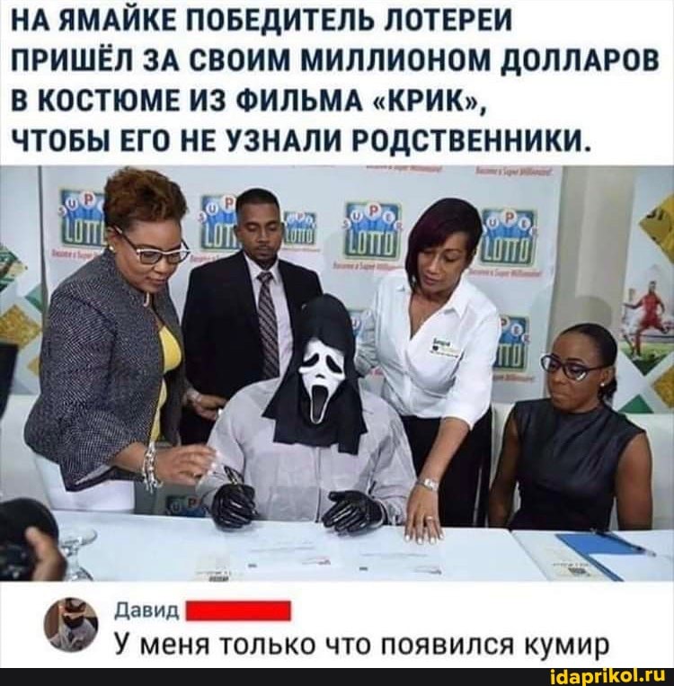 НА ЯМАЙКЕ ПОБЕДИТЕЛЬ ЛОТЕРЕИ ПРИШЁЛ ЗА СВОИМ МИЛЛИОНОМ ДОЛЛАРОВ В КОСТЮМЕ ИЗ ФИЛЬМА "КРИК", ЧТОБЫ ЕГО НЕ УЗНАЛИ РОДСТВЕННИКИ. Давид У меня только что появился кумир - ) / АйДаПрикол .)