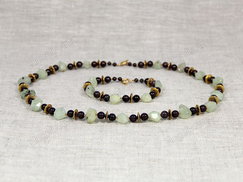 Комплект бусы и браслет из зеленого пренита грубой огранки и граната от Nur