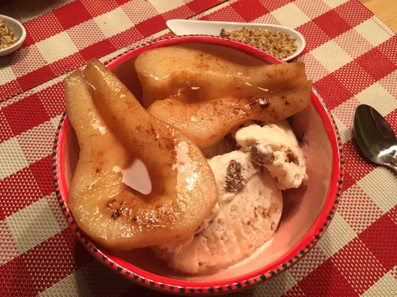 Peras a la canela sous vide sobre helado de nuez para el postre navideño
