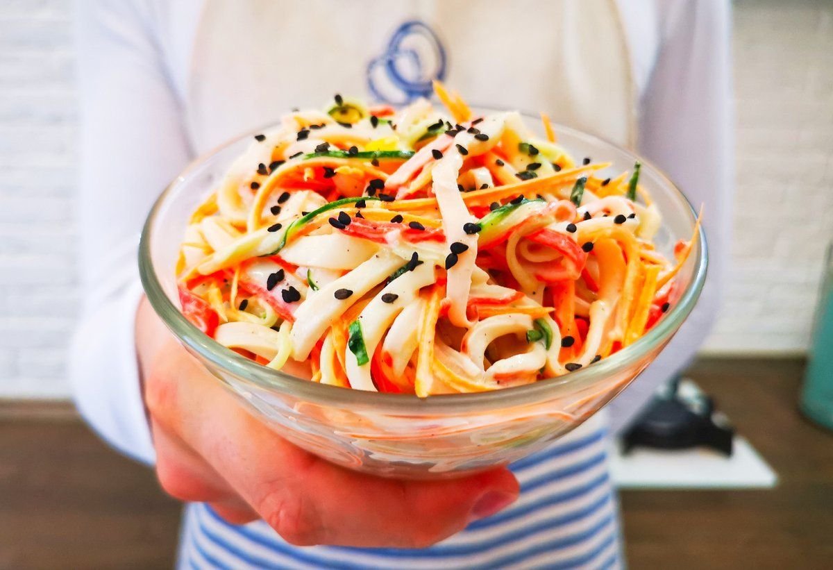 Он такой вкусный, что хочется есть его снова и снова: беру крабовые палочки, кальмары и готовлю салат «Кани сарада» - просто, быстро, вкусно Очень вкусный салат получается! Легкий, простой и готовится быстро! Один из моих любимых салатов с крабовыми палочками! Я делаю его и на праздничный стол и просто, когда хочется вкусного салата!