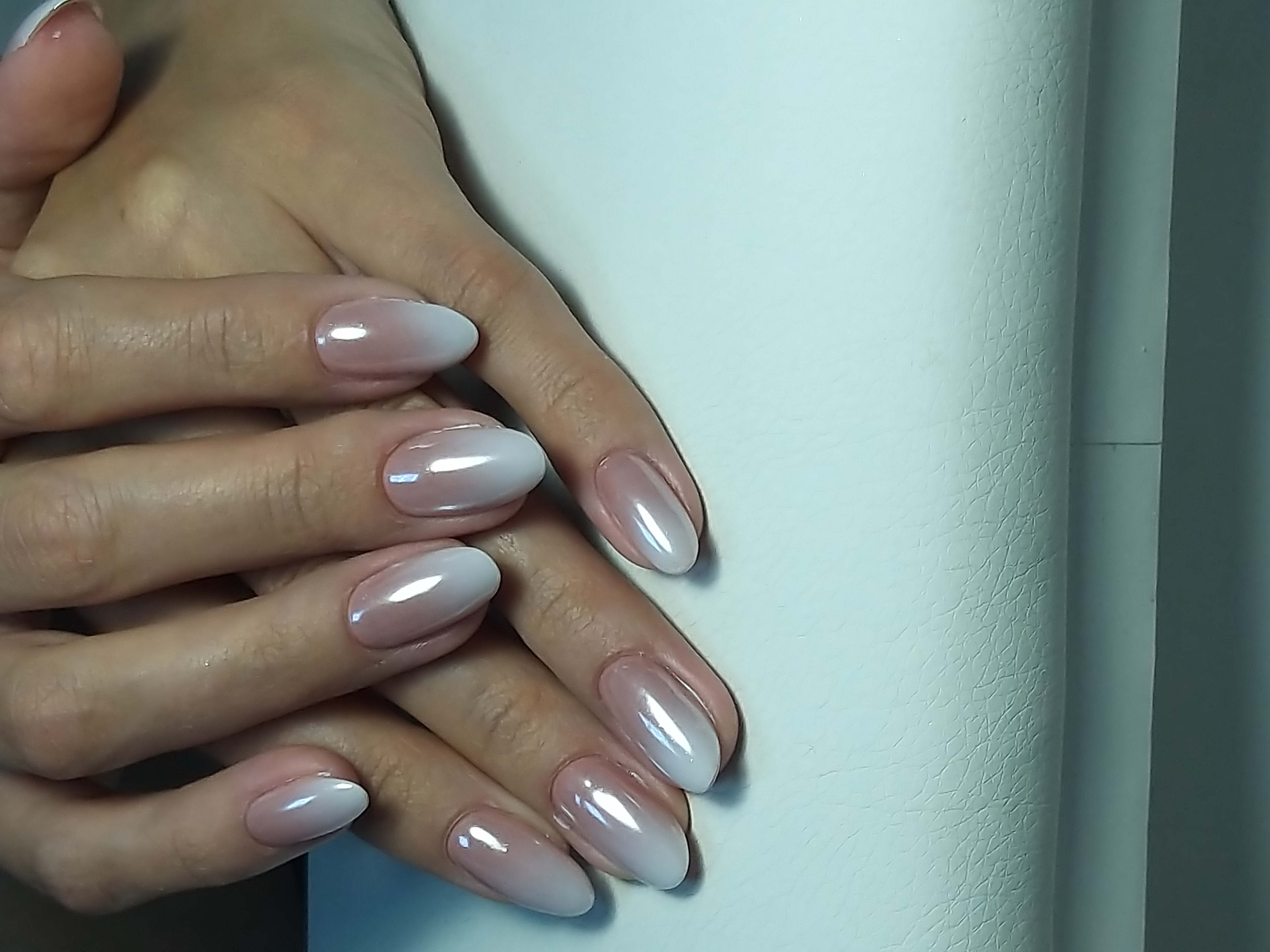 Нюдовый маникюр со светлым градиентом и блестящей втиркой. Смотрите «Нюдовый маникюр со светлым градиентом и блестящей втиркой» от Ирина.