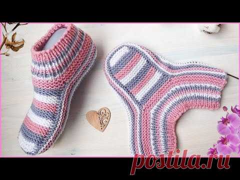 Домашние следки спицами. Простые тапочки без швов на подошве.