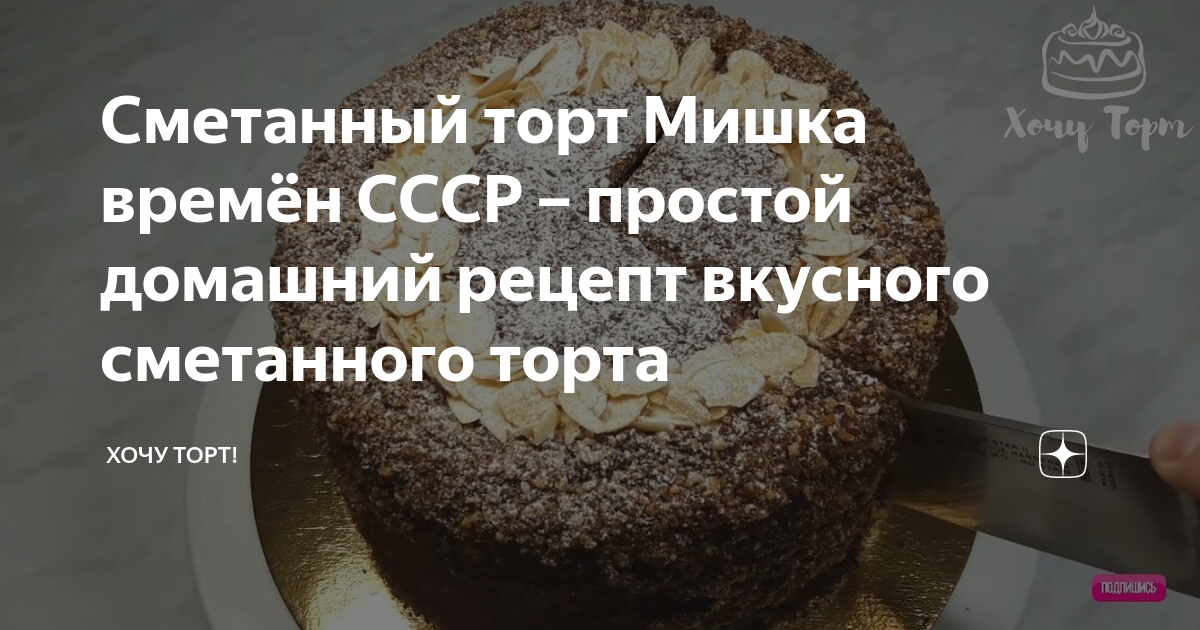 Сметанный торт Мишка времён СССР – простой домашний рецепт вкусного сметанного торта Здравствуйте! Сегодня готовим сметанный торт «Мишка». Это старый советский рецепт времен полного дефицита продуктов, поэтому состоит он из самых простых, ингредиентов. Крем и коржи готовятся на сметане, благодаря чему торт получается очень нежным, домашним и простым в исполнении. ИНГРЕДИЕНТЫ Тесто для 6-8 коржей D20 см: 315 гр. сахара 250 гр. муки (в/с) + 30 гр. (для белых коржей) 350 гр. ...