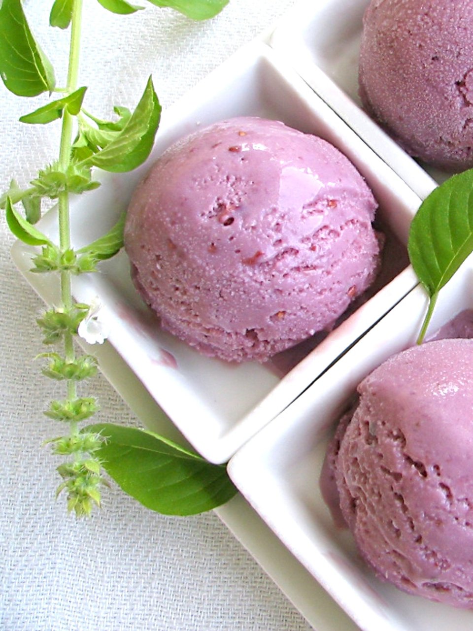 мороженое джелато с черникой, лимонным соком и листьями базилика.