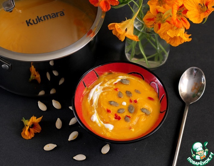 - Приготовить все ингредиенты для супа. Я готовила в высококачественной кастрюле ТМ Kukamara, кастрюля с толстым дном, в ней прекрасно томился суп. Тыкву нарезать на куски, сделать на них надрезы до самой корочки. Кусочки тыквы выложить на противень, смазать растительным маслом, посолить, поперчить, сверху выложить несколько неочищенных зубочков чеснока. Запеките тыкву с чесноком в разогретой духовке при температуре 200-220 градусов 40-45 минут. Нарежьте лук. В кастрюлю налейте растительное масло, добавьте сливочное масло, разогрейте и обжарьте лук до легкой золотистости. Запеченный чеснок очистите и обжарьте вместе с луком пару минут Ложкой выскоблите мякоть тыквы и добавьте в кастрюлю. Имбирь очистите и натрите на мелкой терке, нарежьте острый перец Добавьте в кастрюлю В кастрюлю влейте бульон или воду, посолите, доведите суп до кипения, проварите 2-3 минуты. Пробейте суп блендером. Выключите огонь, добавьте в суп сок лайма, поперчите по вкусу. Дайте супу потомиться 10-15 минут, в кастрюле от ТМ Kukmara толстое дно и суп равномерно дойдет до идеальной кондиции. Подавайте суп со сметаной, любимой зеленью, тыквенными семечками, мелко нарезанным острым перцем и пр.