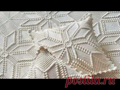 ПЛЕД И ПОДУШКА КРЮЧКОМ. СХЕМА ВЯЗАНИЯ. РЯД 1-4. С таким узором можно связать плед, наволочку на подушку и чехол на табурет. Подойдет для подушки, пряжа 260-320 м на 100 гр. Крючок 2,5-3 мм. На один квадрат уходит до 1 мотка. Узор универсален тем, что можно подогнать под любой размер квадратной вяз.подушки