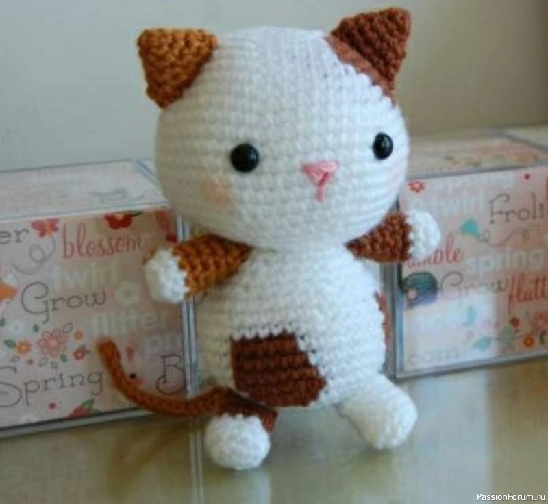 Котенок. Автор: amigurumika Голова: 1 ряд: набрать 2 вп и провязать 6 сбн во вторую от крючка петлю [6]. 2 ряд: * прибавка *. Повторить * 6 раз [12]. 3 ряд: * 1 сбн, прибавка*. Повторить * 6 раз [18]. 4 ряд: * 2 сбн, прибавка*. Повторить * 6 раз [24]. 5 ряд: * 3 сбн, прибавка*. Повторить * 6...