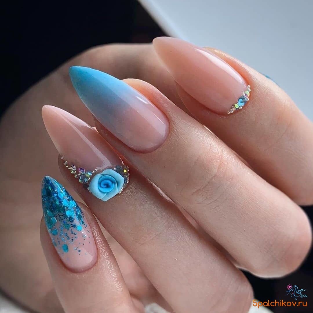 Комбинированный красивый маникюр градиент, блеск и цветы