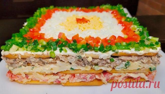 Закусочный торт на крекерах с яйцами и рыбными консервами