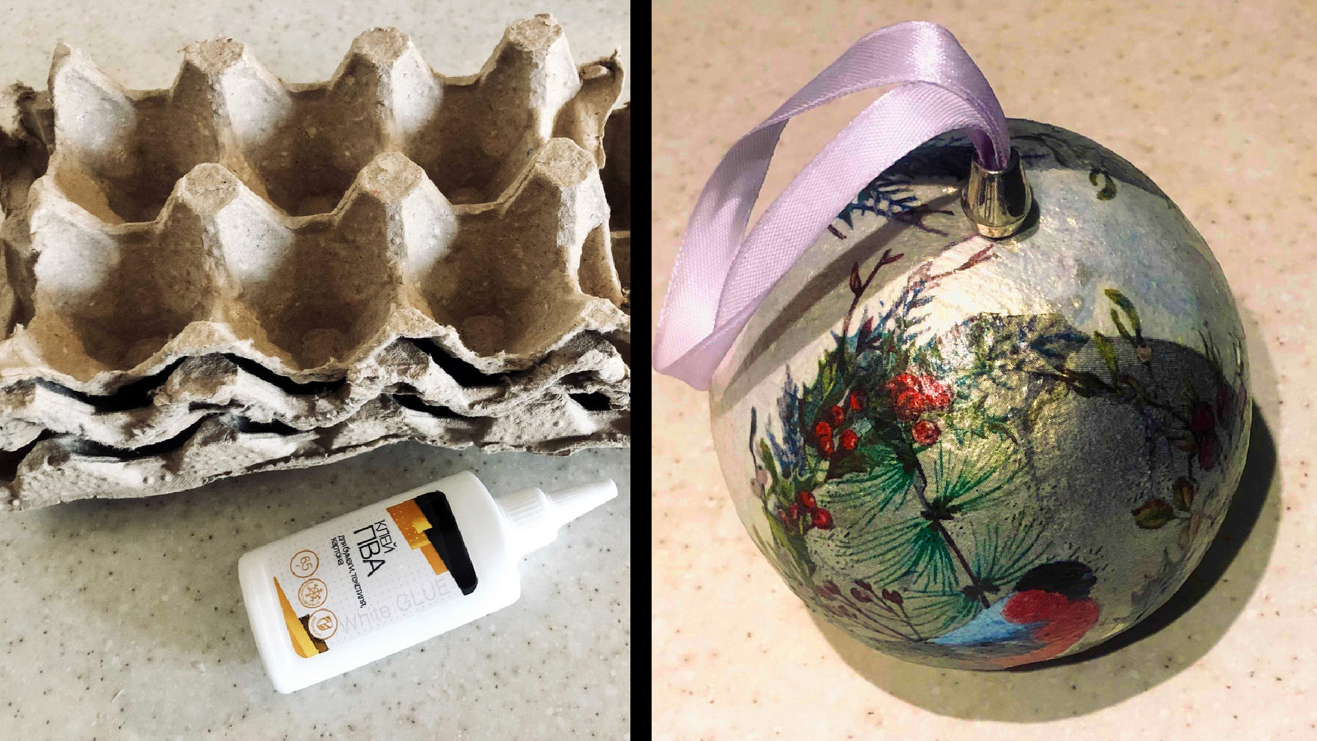 Ёлочный шар из упаковки от яиц Красивая новогодняя игрушка ручной работы стоит недешево, но ее можно изготовить и самостоятельно. При совмещении техники папье-маше и техники декупажа изделия салфетками получаются вполне приличные ёлочные украшения даже при отсутствии опыта. Капитальных вложений для этого не потребуется. Если в