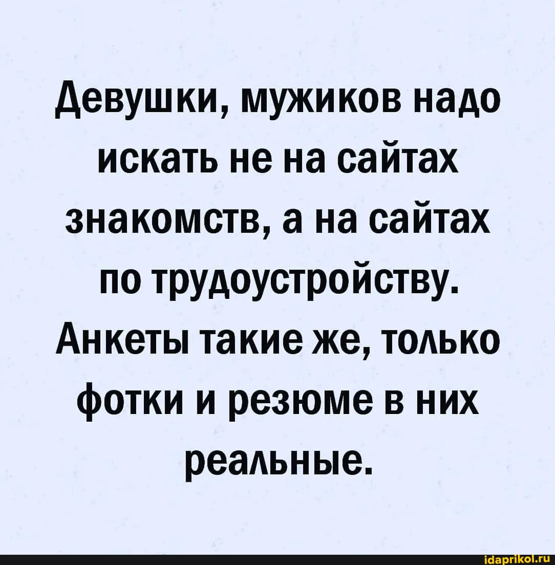 Девушки, мужиков надо искать не на сайтах знакомств, а на сайтах по трудоустройству. Анкеты такие же, только фотки и резюме в них реальные. - ) / АйДаПрикол .)