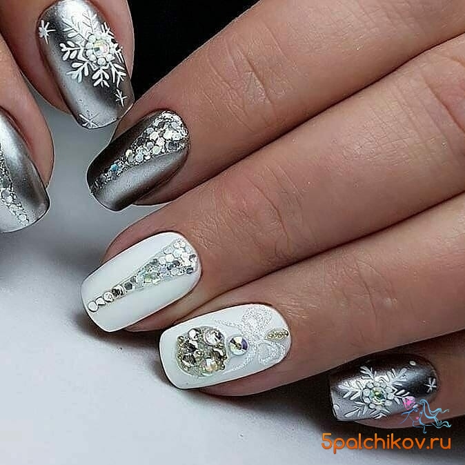 Идея новогоднего маникюра белый с серебром, стразами, снежинками и елочными украшениями