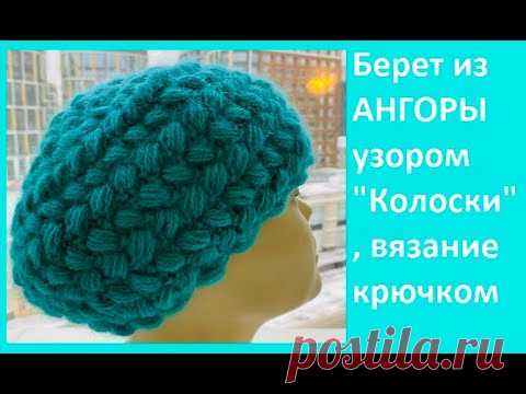 БЕРЕТ из АНГОРЫ узором "КОЛОСКИ" , Вязание КРЮЧКОМ , crochet beanie ( Ш №212)