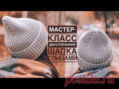 Мастер-класс двусторонняя стильная простая шапка спицами резинкой 1на 1 с красивой макушкой.