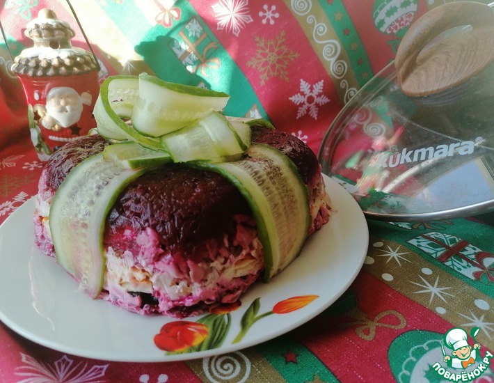 - Отварить свеклу до готовности. Куриные бедра также сварить Морковь натереть на терке и обжарить на растительном масле Далее выкладывать салат слоями в следующем порядке: половина свеклы... Затем мелко нарезанное мясо с куриных бедер и порубленные орехи. Смазать майонезом. Выложить морковь и натертый сыр Затем выложить порезанный чернослив, смазать майонезом и последним слоем вторую половину свеклы с чесноком. Украсить по желанию