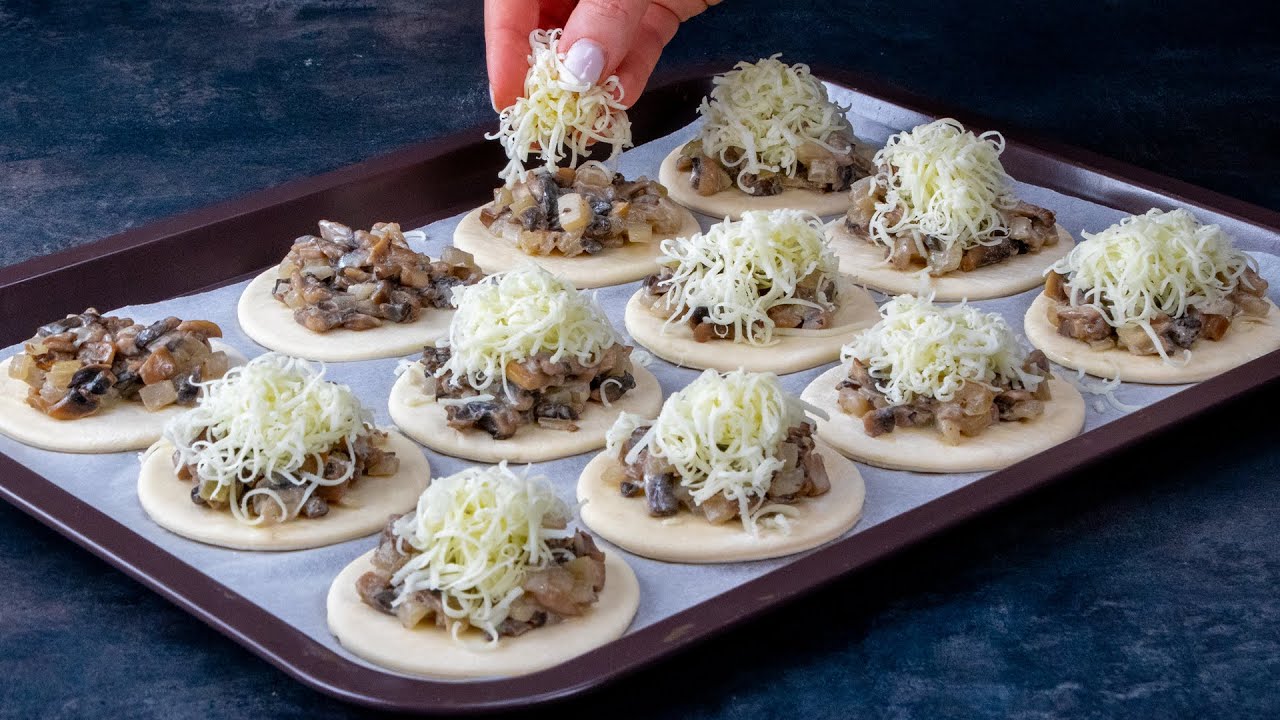 Гости ”дерутся” за эту закуску из слоеного теста. Обожают буквально все! Ингредиенты: грибы - 200 г лук - 1 головка растительное масло - 25 мл соль - 5 гсметана - 40 г слоеное тесто - 200 г моцарелла - 150 гФорма размером 24 см х 28 см В РАЗОГРЕТУЮ ДО 180°C ДУХОВКУ / 20 МИНУТ