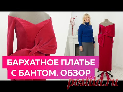 Красное платье с бантом из бархатной ткани. Показ платья с открытыми плечами из бархата.