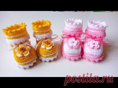 пинетки сапожки спицами праздничные. Полный МК для начинающих.
