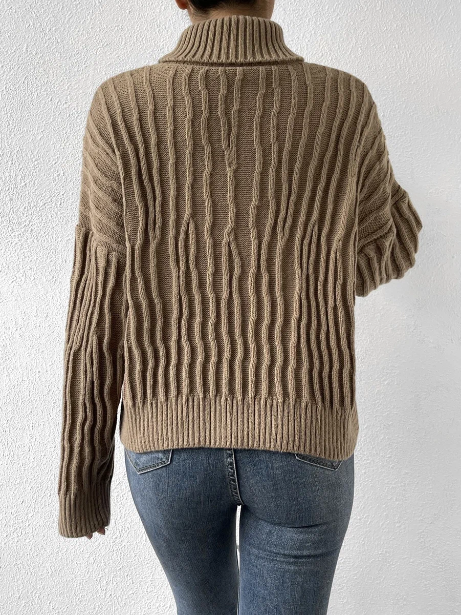 Модель № 1 - свитер белого цвета в спортивном стиле. У него удлиненный рукав, собранный гармошкой и ворот-гольф, как у спортивных лонгсливов (со шнурком по краю).