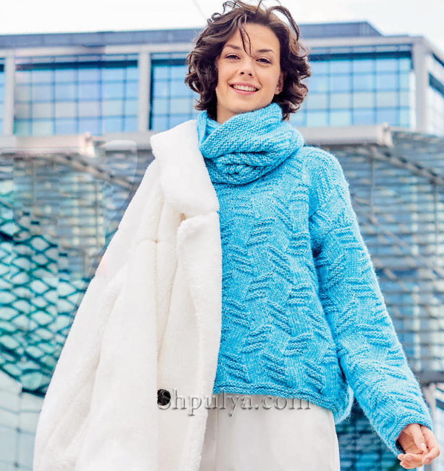 Вязаный комплект, состоящий из пуловера и практичного снуда, заменяющего воротник, связан спицами структурным узором с диагональными рубчиками из шерсти альпаки с хлопком бело-голубого цвета.