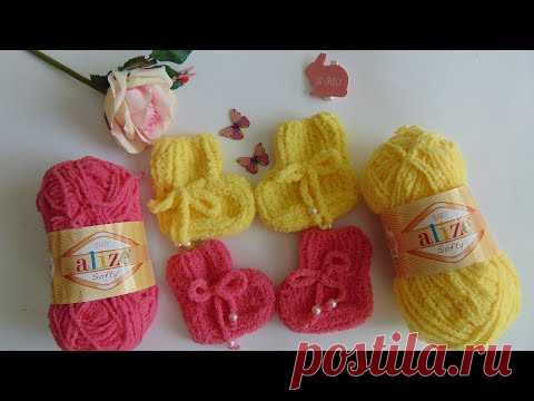 МК. Как связать пинетки спицами для новорожденных из пряжи Софти. Видео урок. Мягкая пряжа.