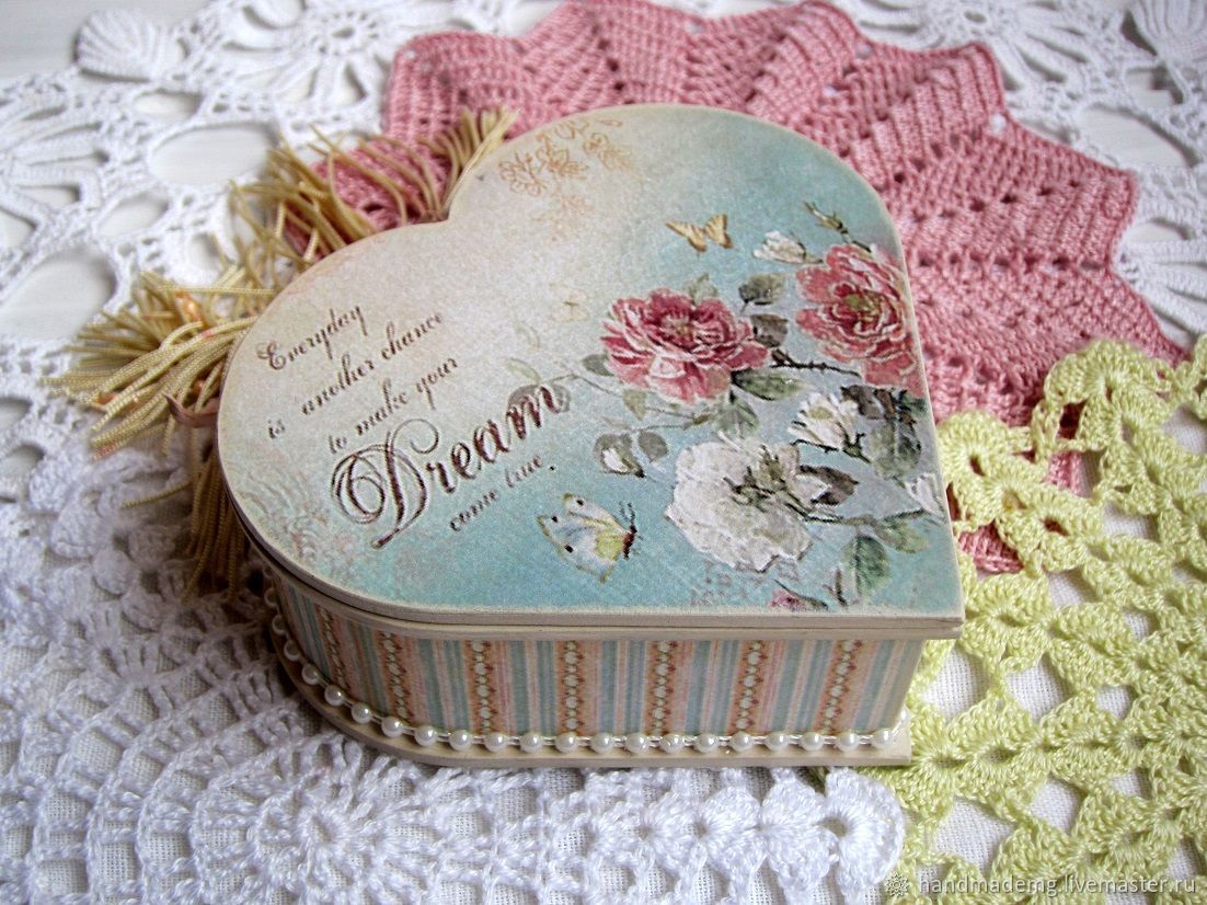 Шкатулка. Мечта. – купить на Ярмарке Мастеров – HS0IBRU | Шкатулки, Москва Шкатулка. Мечта. . в интернет-магазине на Ярмарке Мастеров. Шкатулка в виде сердца, выполнена в технике декупаж, покрыта бархатным лаком, приятна на ощупь. Не большая шкатулка для хранения милых сердцу украшений и мелочей. Отличный подарок на день влюблённых.