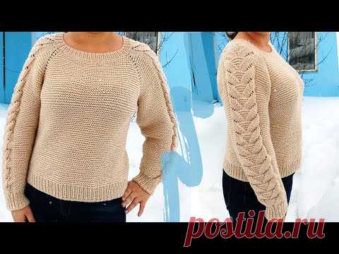 Пуловер спицами Регланом сверху с Красивым узором на рукавах