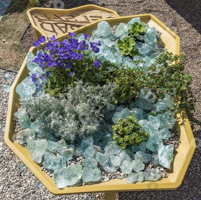 Изображение крупным планом декоративной клумбы с цветами и декоративными растениями, камнями и минералами. - Ozero - российский фотосток
